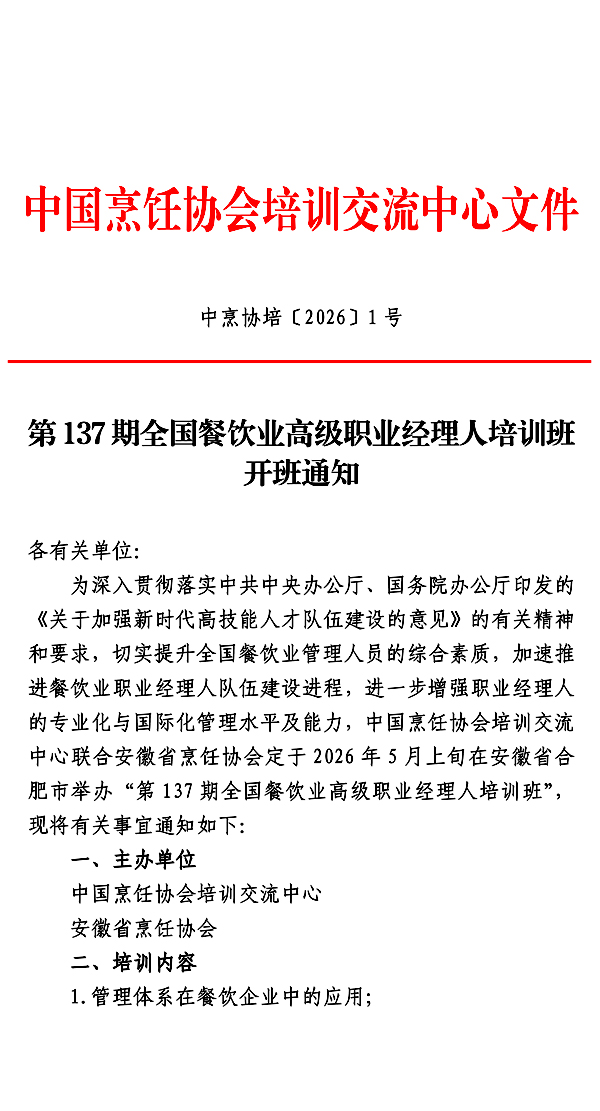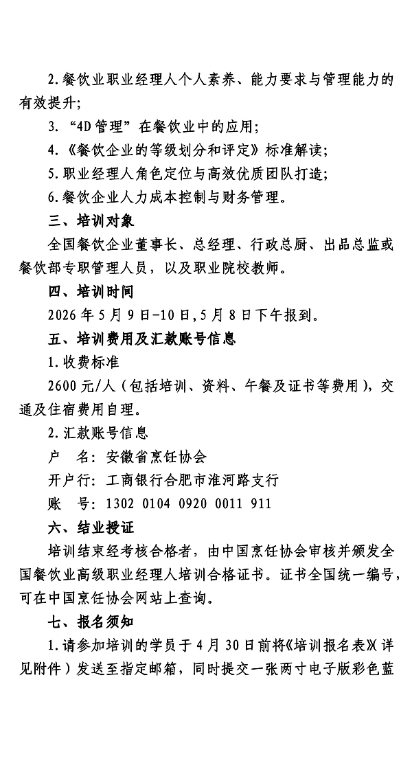 全国餐饮业高级职业经理人培训将于5月上旬在合肥举办